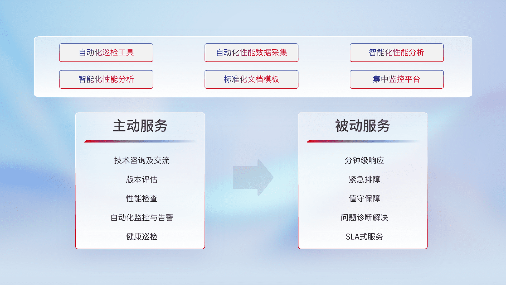 智能化工具和标准化文档,,,,保障服务质量,,提供主动服务(包含技术咨询、、、、版本评估、、、、性能检查、、、、自动化监控与告警、、、健康巡检)和被动服务包含(分钟级响应、、紧急排障、、、值守保障、、、问题诊断解决、、、SLA服务)。。。。
